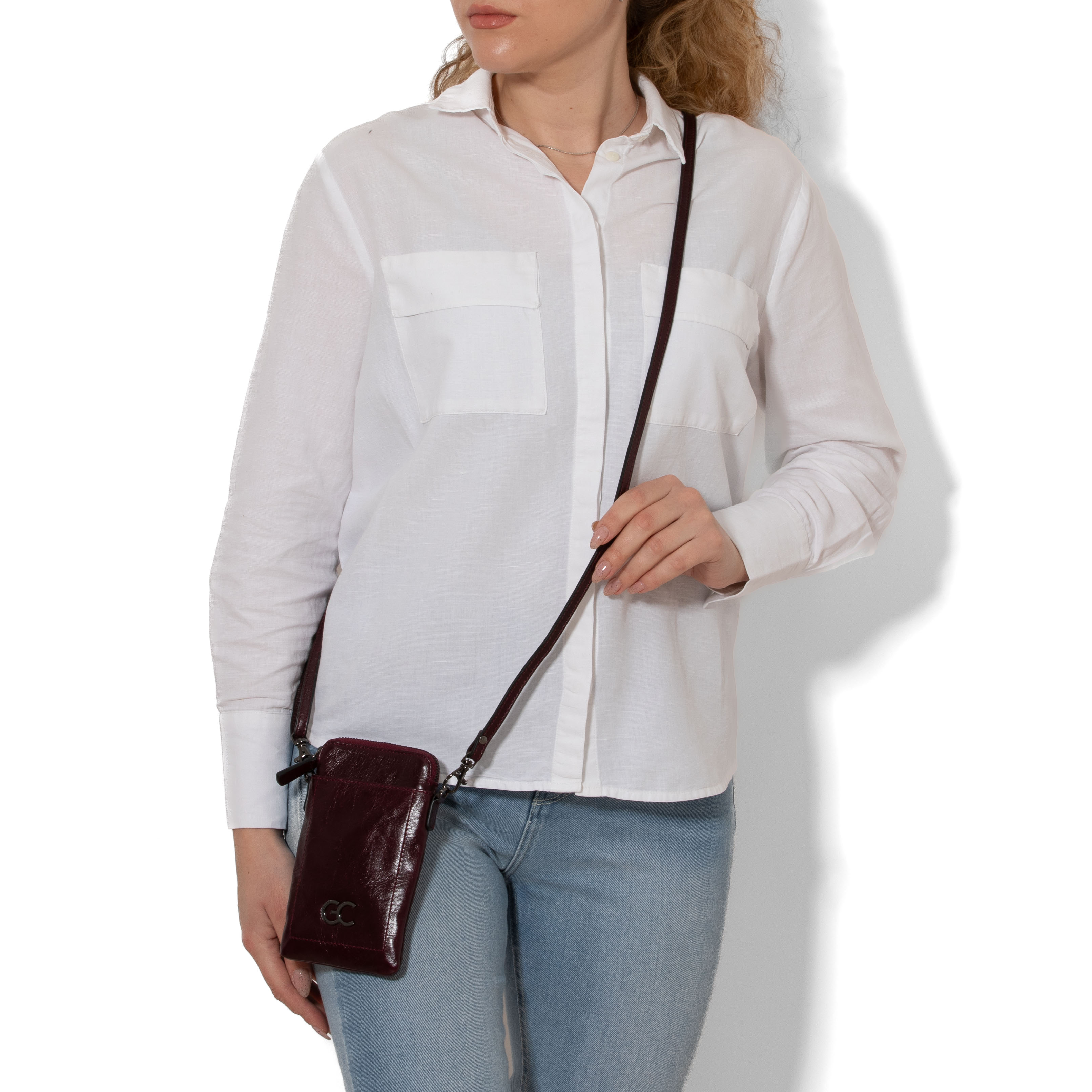 Fashionable phone bag from Gianni Conti in soft calfskin. This is a small sized ladies phone bag with a long adjustable shoulder strap.