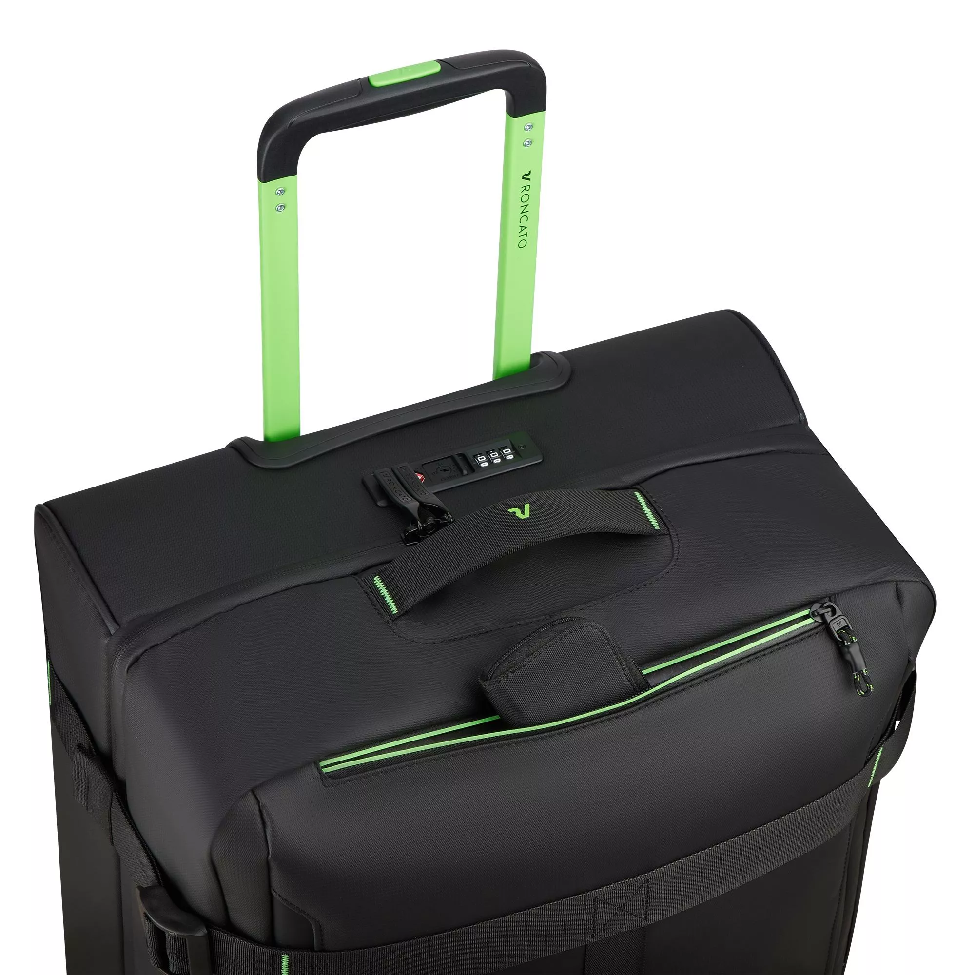 Padded front handle with rubber logo, providing extra support during travel