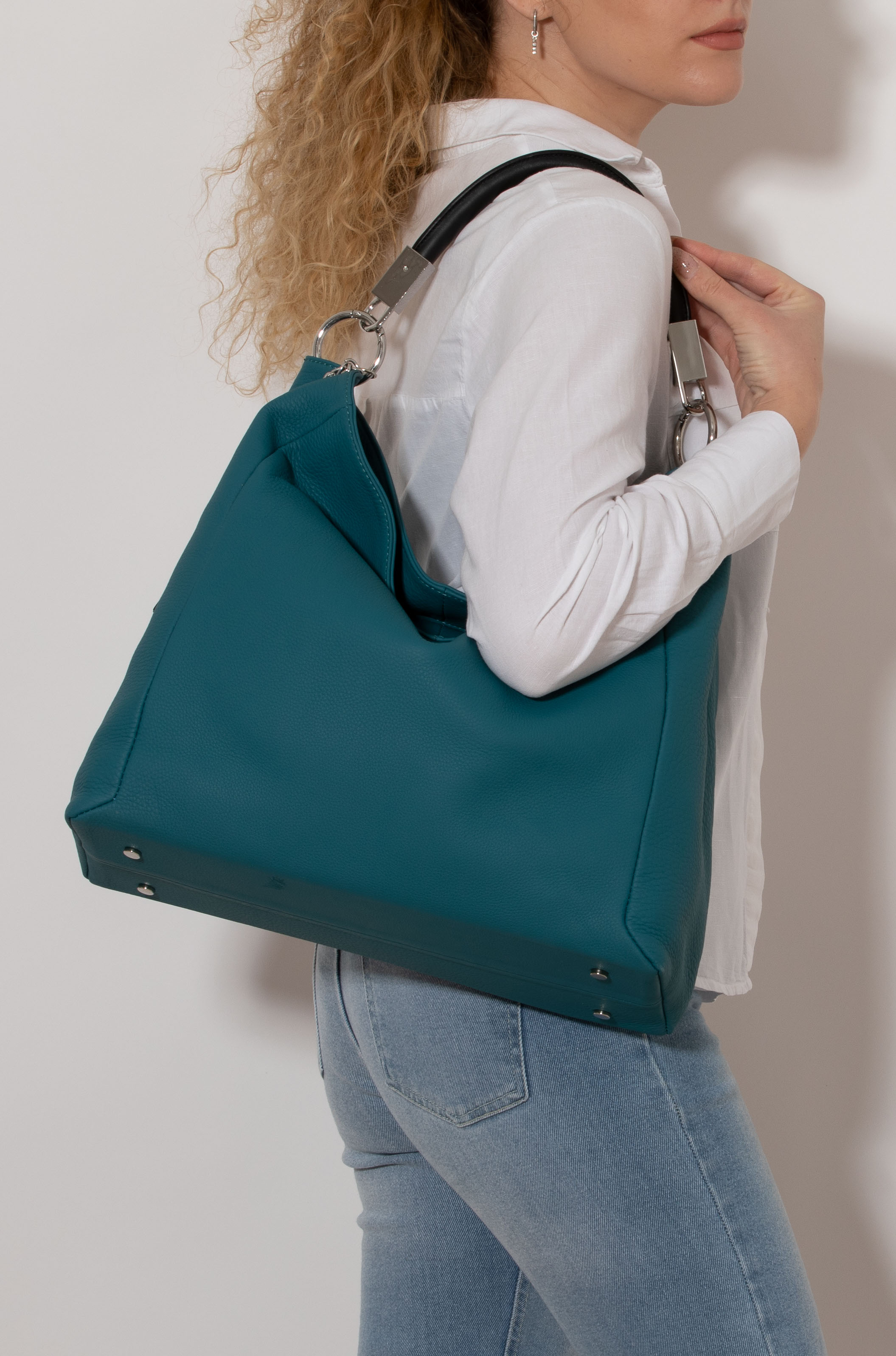 Large and elegant shoulder bag in soft cow leather, with a graceful and light shape.